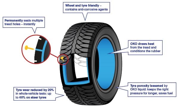Tyre sealant is used as a preventative measure to reduced puncture related down-time and reduce the expenses of puncture repair or tyre replacement. Tyre Sealant is cost effective and easy to install. We offer the market leading brand of OKO sealing liquids.