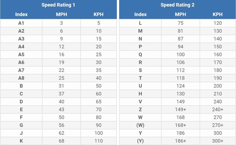 A 4x4 tyre's Speed Index is the maximum safe speed that the tyre is manufactured to travel at, and is represented by a letter from A to Z. The tyre's Load Index is the maximum weight that the tyre can safely support, and is a one or two digit number. The higher this number is the more weight the tyre can carry. It is imperative for the safety of the vehicle and its occupants that tyres with high enough Speed and Load Indexes are chosen. Check the Load and Speed ratings of your current tyres before ordering replacements. The table below show what each load and speed index number/letter relates to in KG and MPH.