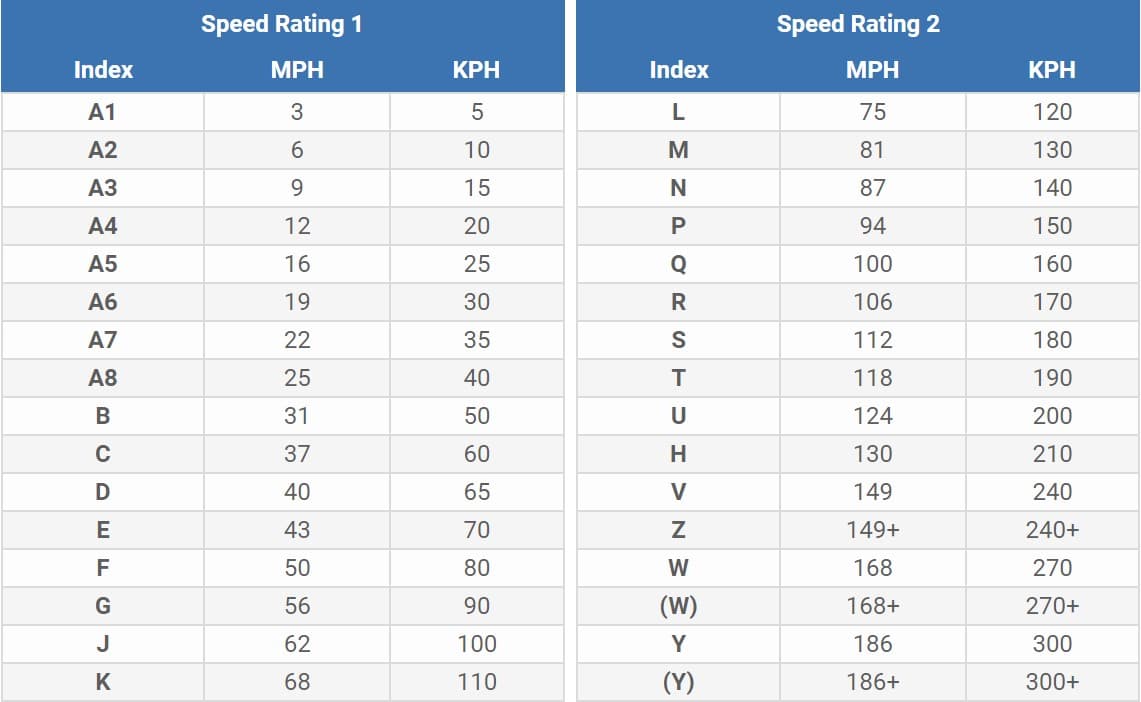 A car tyre's Speed Index is the maximum safe speed that the car tyre is manufactured to travel at, and is represented by a letter from A to Z. The car tyre's Load Index is the maximum weight that the tyre can safely support, and is a one or two digit number. The higher this number is the more weight the car tyre can carry. It is imperative for the safety of the vehicle and its occupants that tyres with high enough Speed and Load Indexes are chosen. Check the Load and Speed ratings of your current car tyres before ordering replacements. The tables below show what each load and speed index number/letter relates to in KG and MPH.