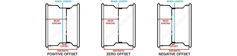Offset: The offset determines how far out your wheel and tyre assembly sit out from your machine. It ties in with your machines track width, that is the distance between your tyre tracks. It's important to work within acceptable offsets / track widths for your vehicle to ensure proper handling, performance and safety. it is measured as the distance between the rims centre plate and the back edge of the rim. If you know the exact offset of the hub then you can provide it, but please specify whether the centre plate is offset towards the front or the back of the wheel, this is known as positive or negative offset, as illustrated in the image below. You can also additionally or alternatively provide the measurement for the front spacing and rear spacing measurements, that is the distances from the face of the centre plate to the edge of the wheel rim.
